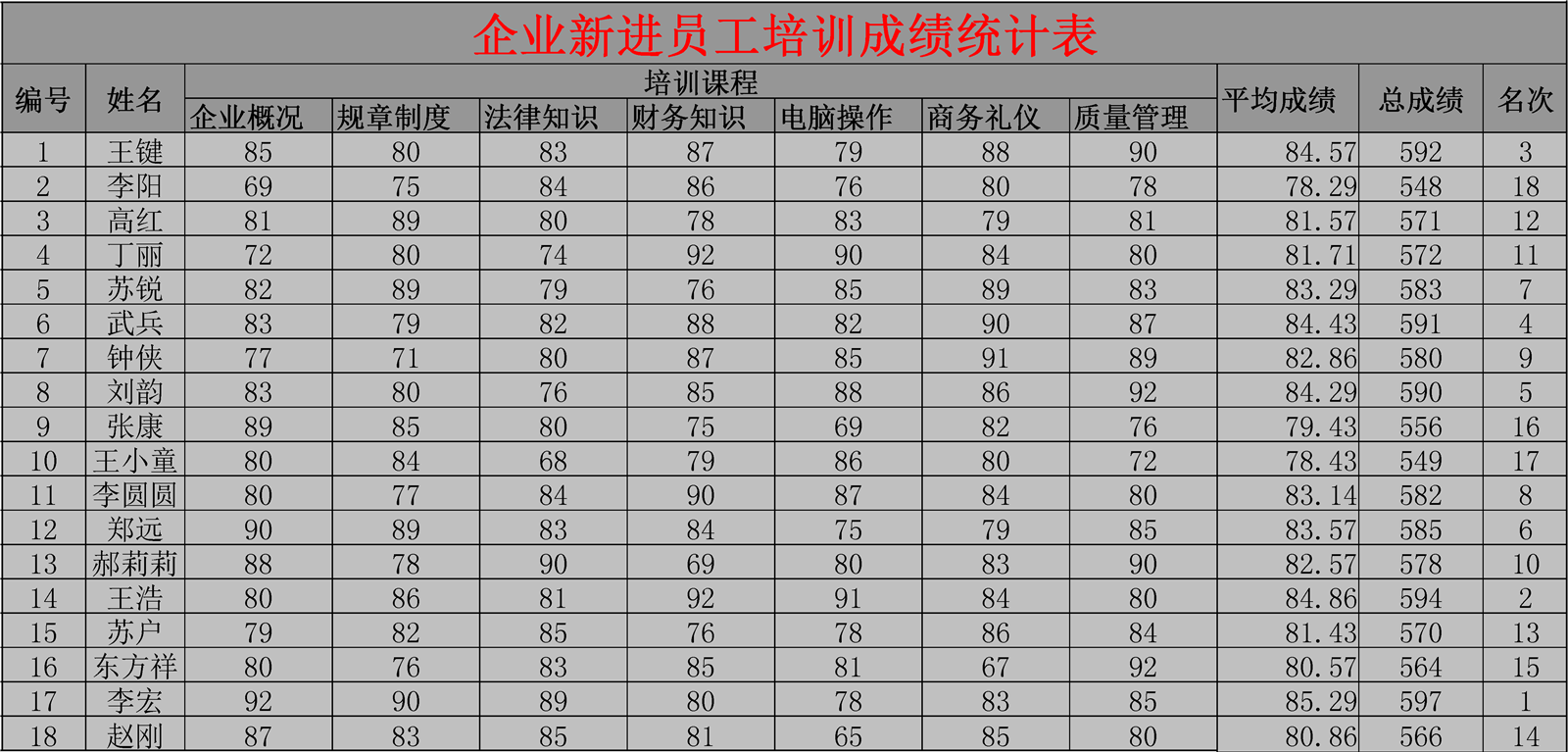 企業新進員工培訓成績統計表介紹:
